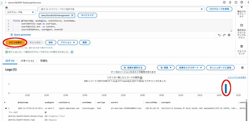 通知メールがあったら、このクエリを選択して、クエリ実行を押します。該当したアクションが1件以上あった時刻に、バーが表示され、その下に、該当データの一覧が表示されます。