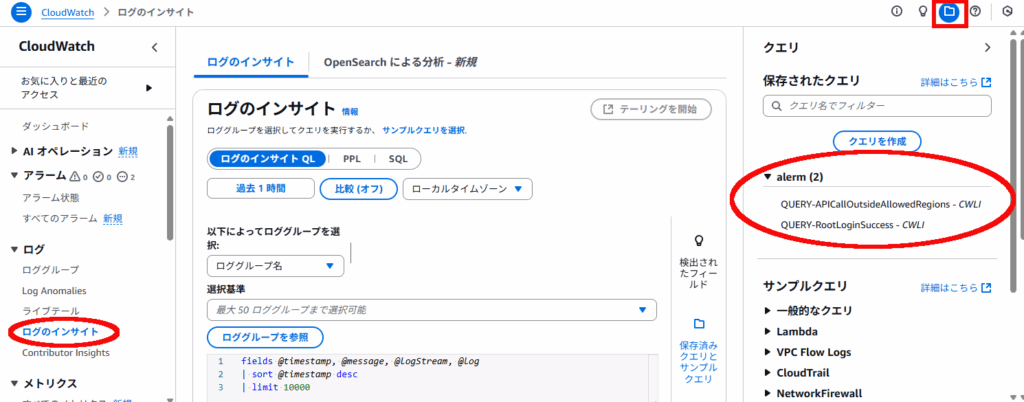AWSコンソールのCloudWatch画面の、「ログのインサイト」の、右上のフォルダマークに、「QUERY-RootLoginSuccess」(rootユーザでログインを検索)、「QUERY-APICallOutsideAllowedRegions」(普段使用しないリージョンでの更新アクションを検索)が出来ています。