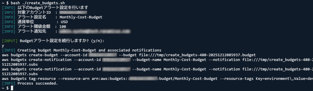その後、設定内容を表示するので、確認の上、yを入力してください(パスワードは表示しません)。