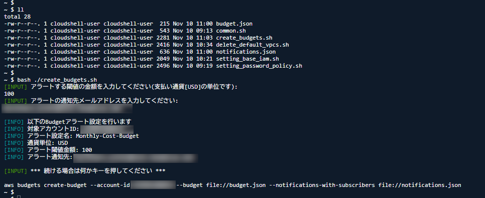 bash ./create_budgets.shインタラクティブに、閾値の金額や通知先メールアドレスを聞くので、入力してください。