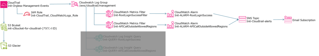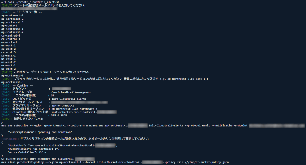 bash ./create_cloudtrail_alert.shインタラクティブに、通知先メールアドレスや、普段使用するリージョンを聞くので、入力してください。