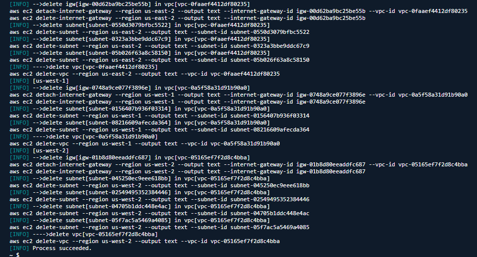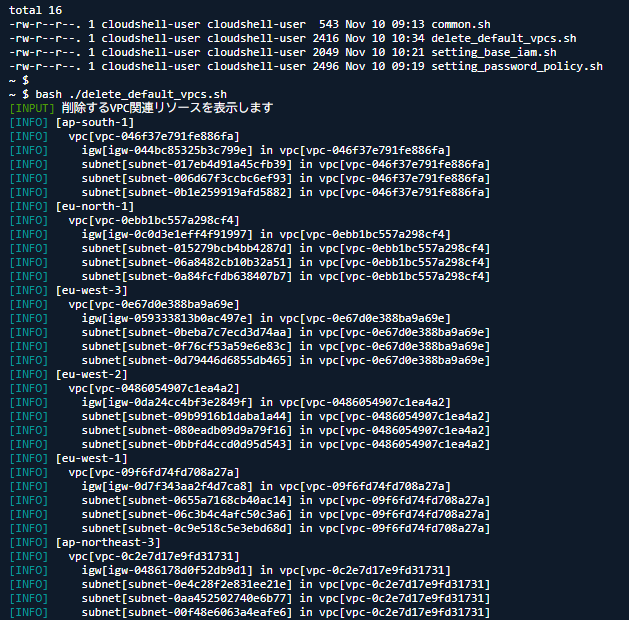 bash ./delete_default_vpcs.sh削除するのは、デフォルトVPCと、その中に作成されているデフォルトインターネットゲートウェイと、デフォルトサブネットです。