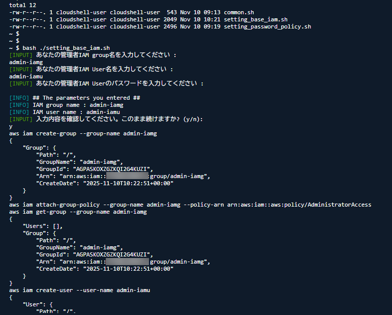 bash ./setting_base_iam.shインタラクティブに、管理者グループ名と、管理者ユーザ名を訊ねてきますので、回答してください。