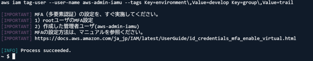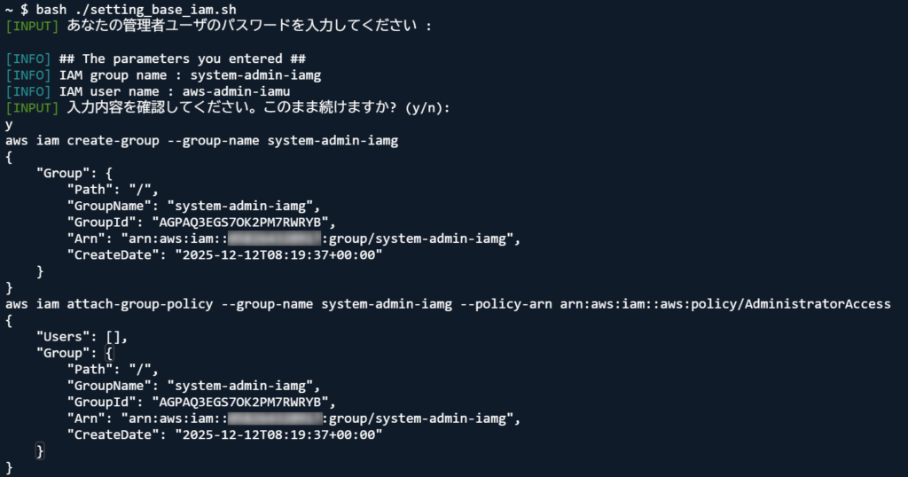 bash ./setting_base_iam.sh管理者ユーザのパスワードを聞くので、先ほど設定したパスワードポリシーに準じたパスワードを入力してください。