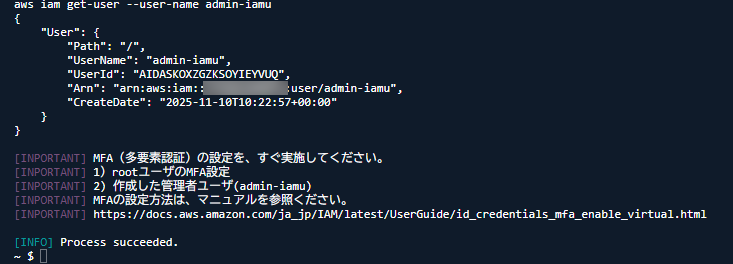 | 3 | IAMユーザにMFA設定 | セキュリティ観点:アカウント乗っ取られ予防 |