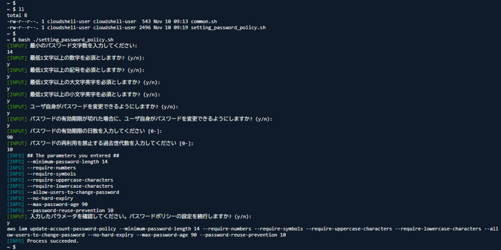 bash ./setting_password_policy.shインタラクティブに、ポリシーの設定を訊ねてきますので、回答してください。