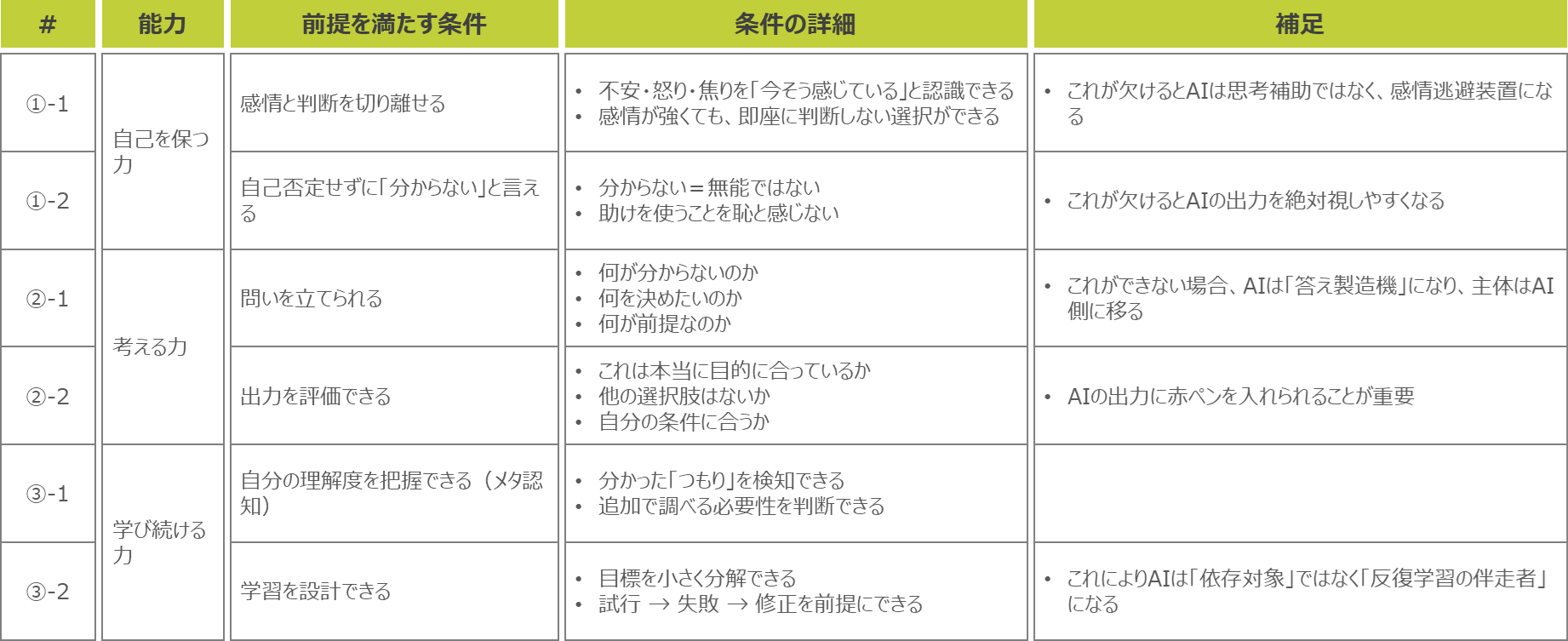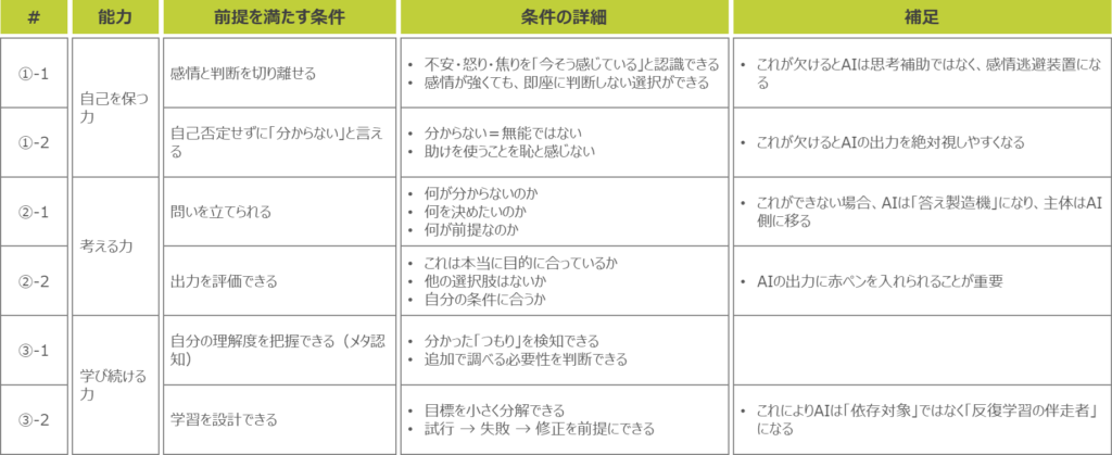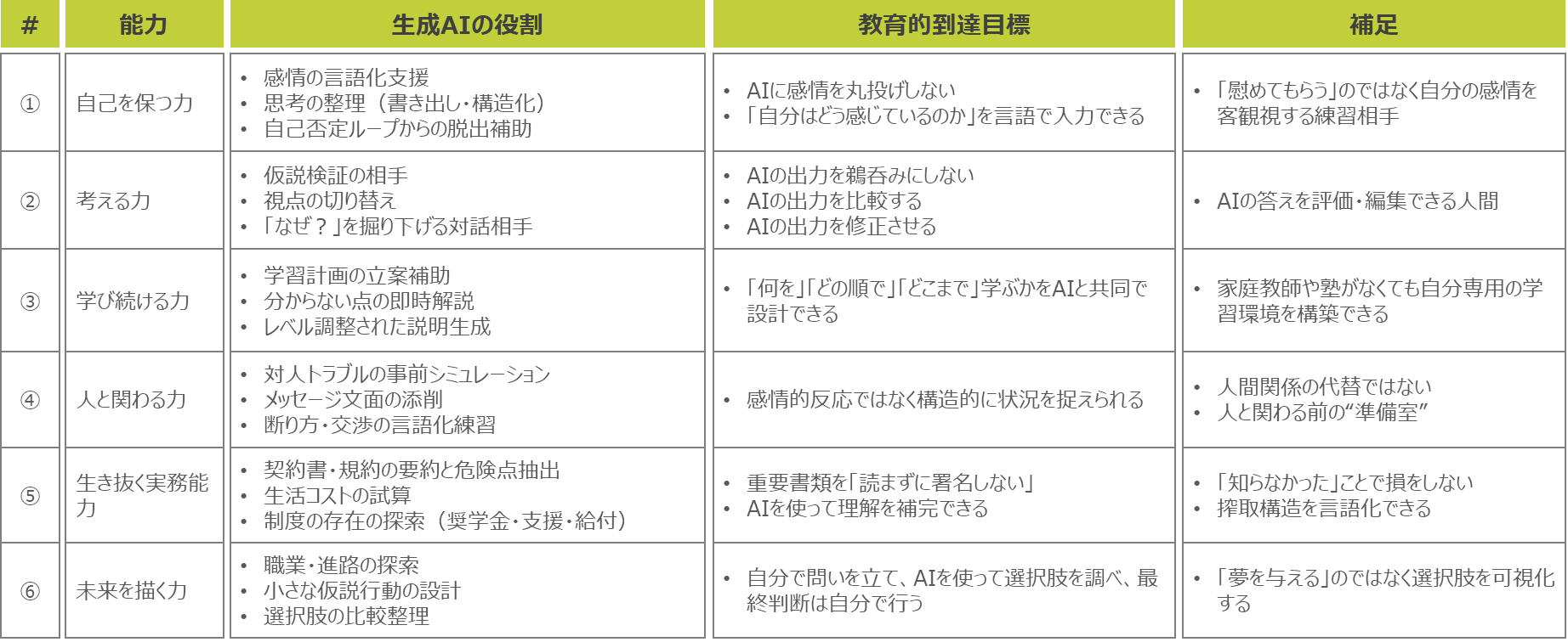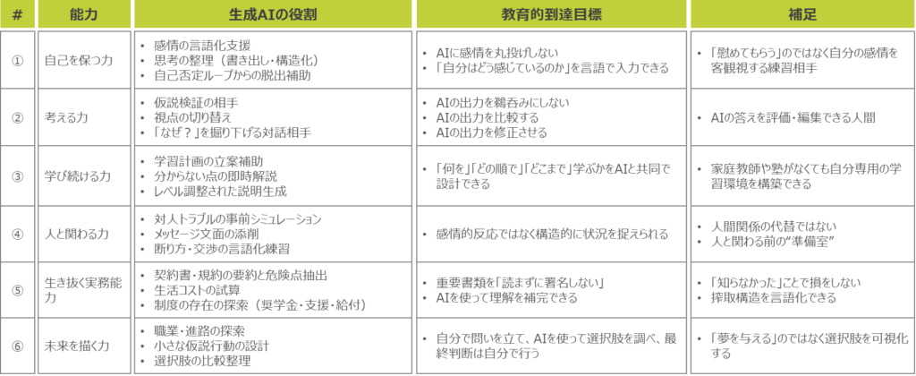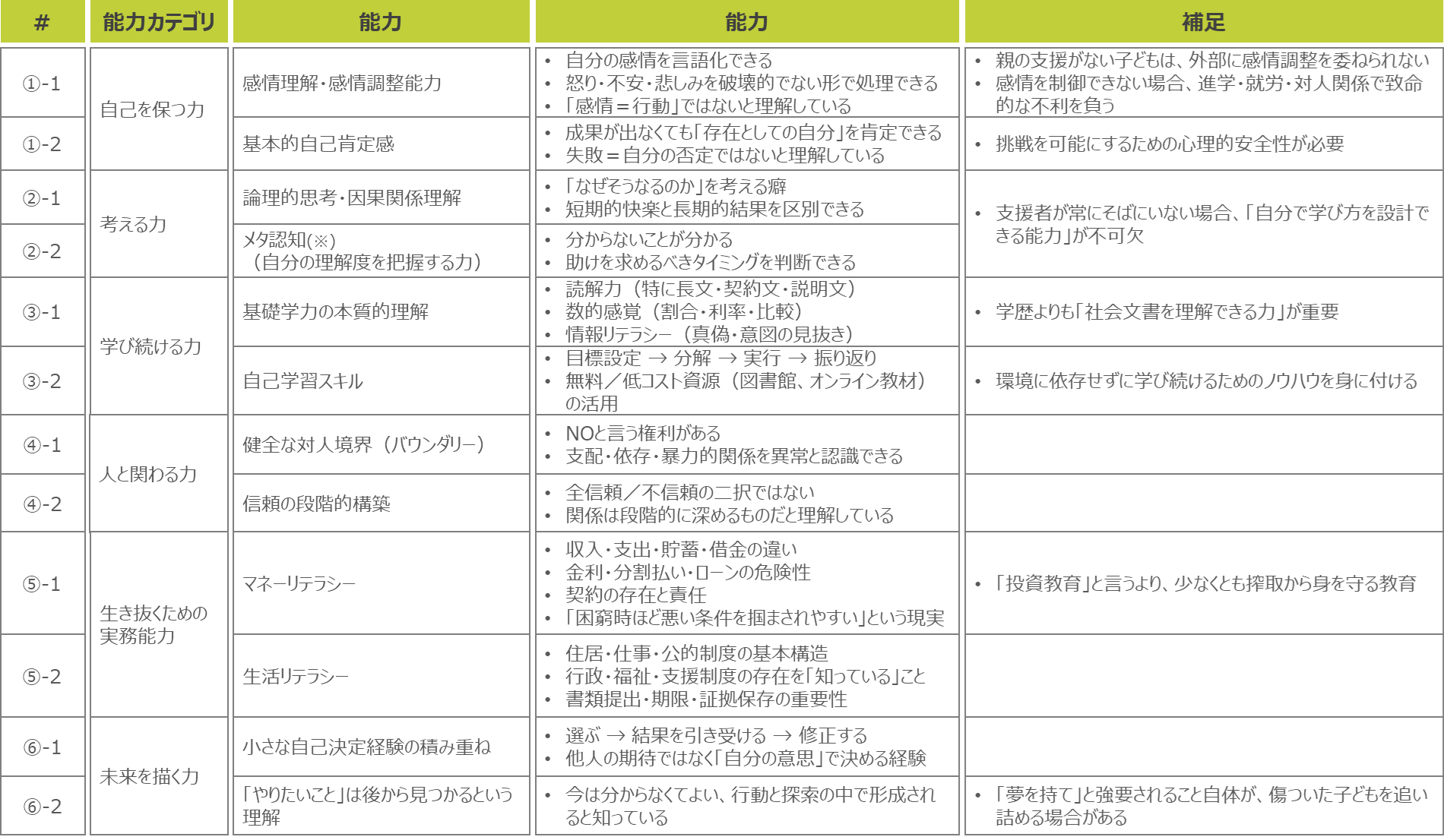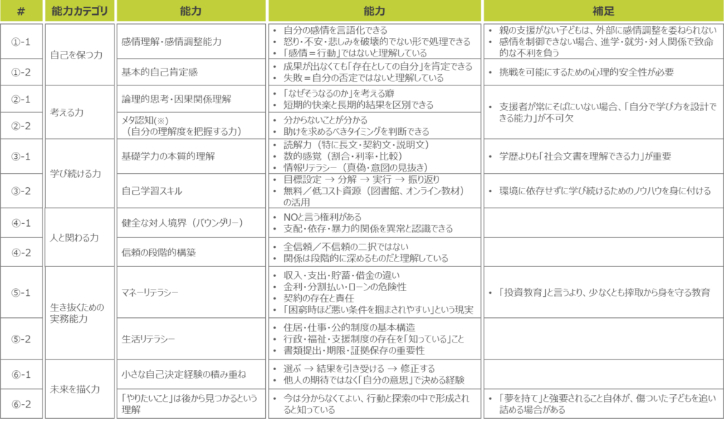 これらは、家庭環境や経済状況といった「環境に依存せずに、意思決定・学習・資源獲得を行える力」であり、「自分を壊さずに考え、学び、選び、助けを使いながら生きる力」であると言えます。