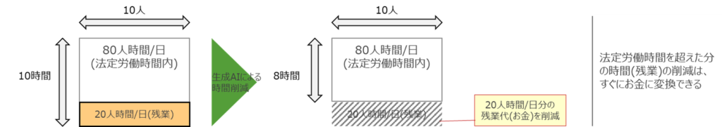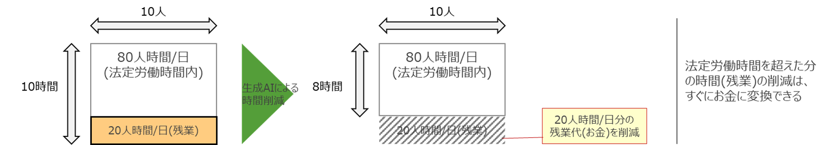 この状況で、生成AIの導入により、1日20時間分の業務が削減できたとすると、慢性的に行われていた残業がなくなり、残業代(お金)が削減できることになります。