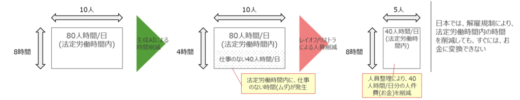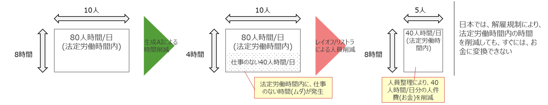 法定労働時間(10人×8時間=80時間)の中の時間を削減した場合、海外では、レイオフやリストラなどで、人員そのものを半分に減らして、人件費(お金)を削減します。